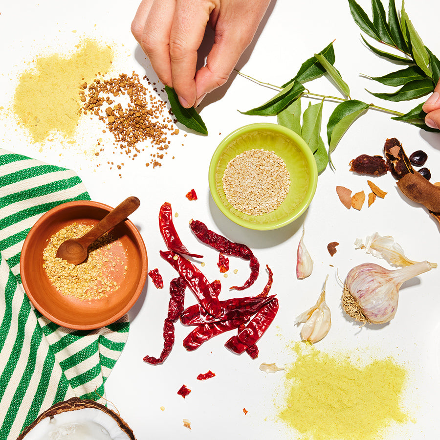 Sesame seeds, flax seeds, coconut, nutritional yeast, chili, jaggery, tamarind, garlic, salt, curry leaves, hing (asafoetida, rice flour, turmeric).